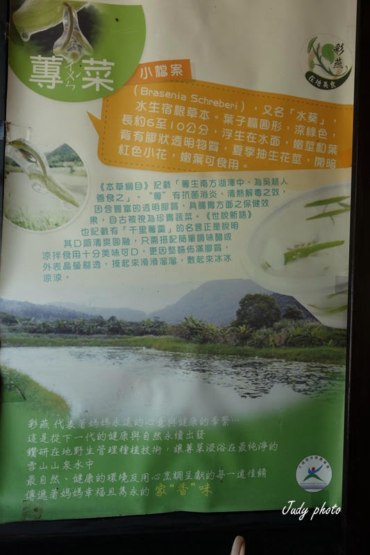 開了快四十分鐘的路程,我們來到雙連埤彩燕在地美食,聽說這兒有種特殊的野菜「蓴菜」吃起來很特別,而且吃了對身體超好的,好不容易大太陽天開了快40分的路程從大同鄉一路直駛到員山雙連埤彩燕在地美食,在點菜區就看馬上開口要點「蓴菜」,點菜的小姐說:「不好意思喔~現在沒有蓴菜耶」,我還真是晴天霹靂耶~沒有辦法只好點了其他山產野菜,好理加在這兒的菜炒得口味很不錯份量又大,所以我們三個人點了三菜一湯,結果中午吃了一餐想不到還有一半可以外包回家吃晚餐,而且口味和中餐一樣美味耶,在家用餐的時間又想到彩燕老闆娘的熱情招呼及介紹我們去消暑的秘密基地,讓我們的渡過在員山消暑的好時光~