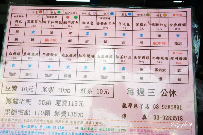 龍潭包子店產品價目表,一共有20種包子饅頭~看了都眼花了~你看到上面貼著綠色、紅色、黃色...等點點就是包子上為了方便辦認點上去的喔~除了現場購買也可以宅配喔~