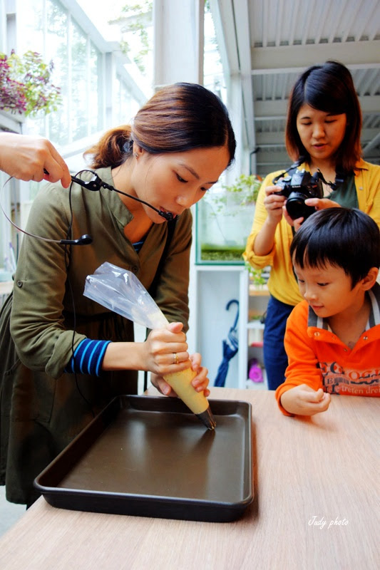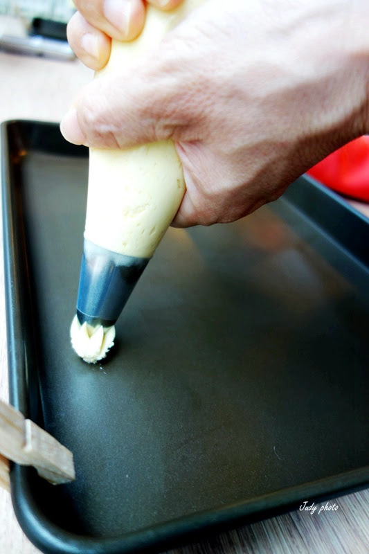 把麵糰從花嘴袋中擠出來,不要間斷力道要一致喔~