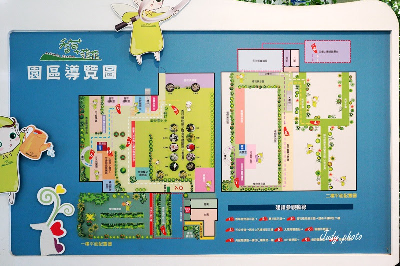 園區導覽圖還有建議參觀動線~園區可分為:【 天空步道 】、【 香菲體驗室 】、【 觀景台 】、【 香菲圖書 】、【 植物香料 】、【水耕生態】、【 香菲 DIY 教室 】、 【香菲小舖 】、【 花園 Buffet 餐廳 】、【 香菲烘焙坊 】..等