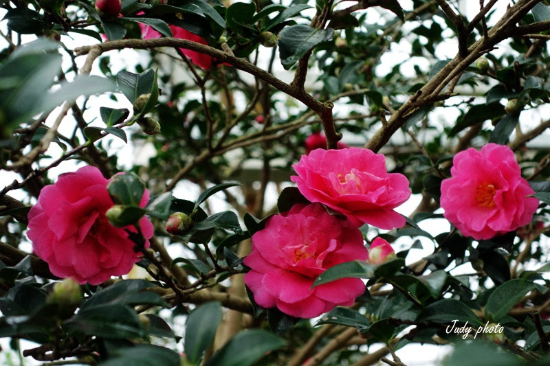 到了停車場就看到雖然是下雨天又是平日卻是門庭若市,門口兩側就擺放著山茶梅驕豔欲滴