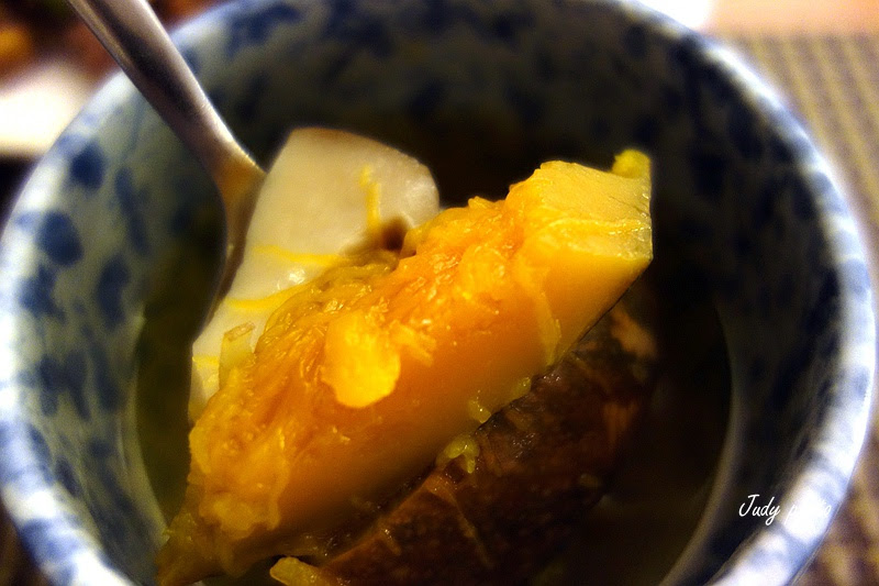一壺菊花烏龍熱茶喝起來很香甜,連不愛喝茶怕有咖啡因的我,喝了都覺得很順口也不覺得有問題,一問才知道原來這壺茶也大有來歷,取至銅鑼杭菊怕農藥殘留每年特尋有機杭菊園大量採購,所以喝起來讓人感覺很安心,一入口後淡淡菊香加上烏龍茶回甘,真棒~