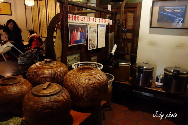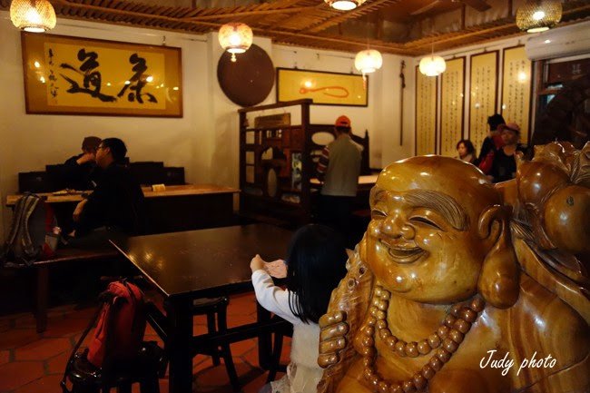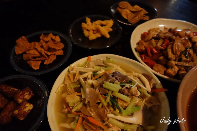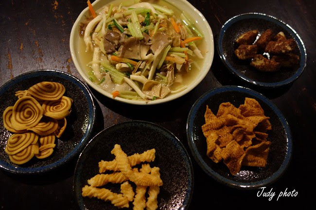 ,她很快速的建議你怎麼點不管是葷是素一下子就點好了,更神奇是我問她怎麼不用寫桌號啊?這樣怎麼會知道是那一桌呢? 她說:這個你不用擔心,服務生會上對菜而且很快速喔,就在疑惑下我們找了位置坐下來了,然後就在大約10分鐘後就都上菜了,實在有夠強的啦~這兒茶水和飯都是自取,還有飯前的點心餅乾可以吃到飽啦~就看著大家一點完菜就開始吃餐前的古早餅乾,還有那茶水是很像七葉膽茶的口感有點甘甘的甜味真的很好喝喔~!! 這兒整体感覺古色古香的很不錯,然後吃素的可以點五行麵口感很好吃喔~!!